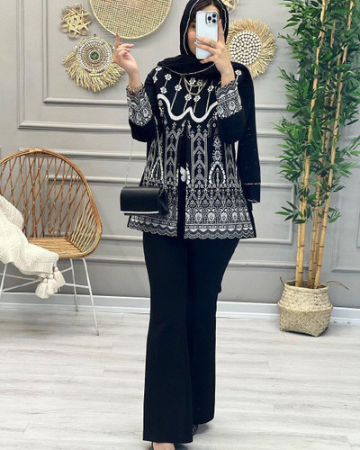 ناموجوداورال مجلسی جلوتنه تمام مروارد دوزی شلوار دمپا گشاد با کمربند🤩
